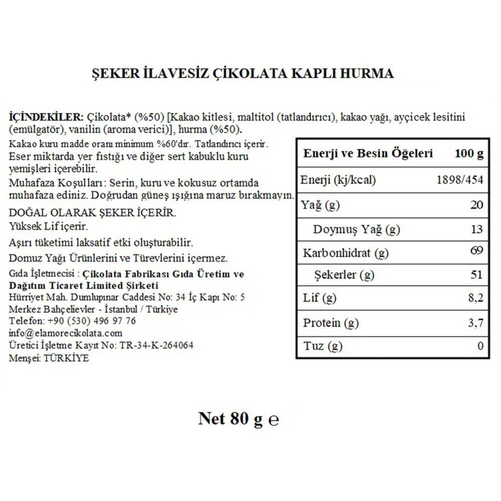 Çikolata* (%50) [Kakao kitlesi, maltitol (tatlandırıcı), kakao yağı, ayçiçek lesitini (emülgatör), vanilin (aroma verici)], hurma (%50).