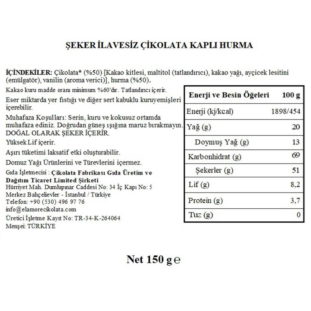 Çikolata* (%50) [Kakao kitlesi, maltitol (tatlandırıcı), kakao yağı, ayçiçek lesitini (emülgatör), vanilin (aroma verici)], hurma (%50).