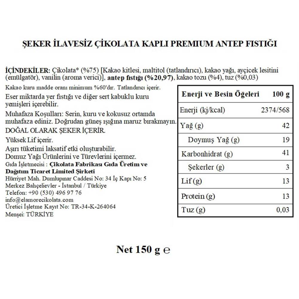 Çikolata* (%75) [Kakao kitlesi, maltitol (tatlandırıcı), kakao yağı, ayçiçek lesitini (emülgatör), vanilin (aroma verici)], antep fıstığı (%20,97), kakao tozu (%4), tuz (0,03).