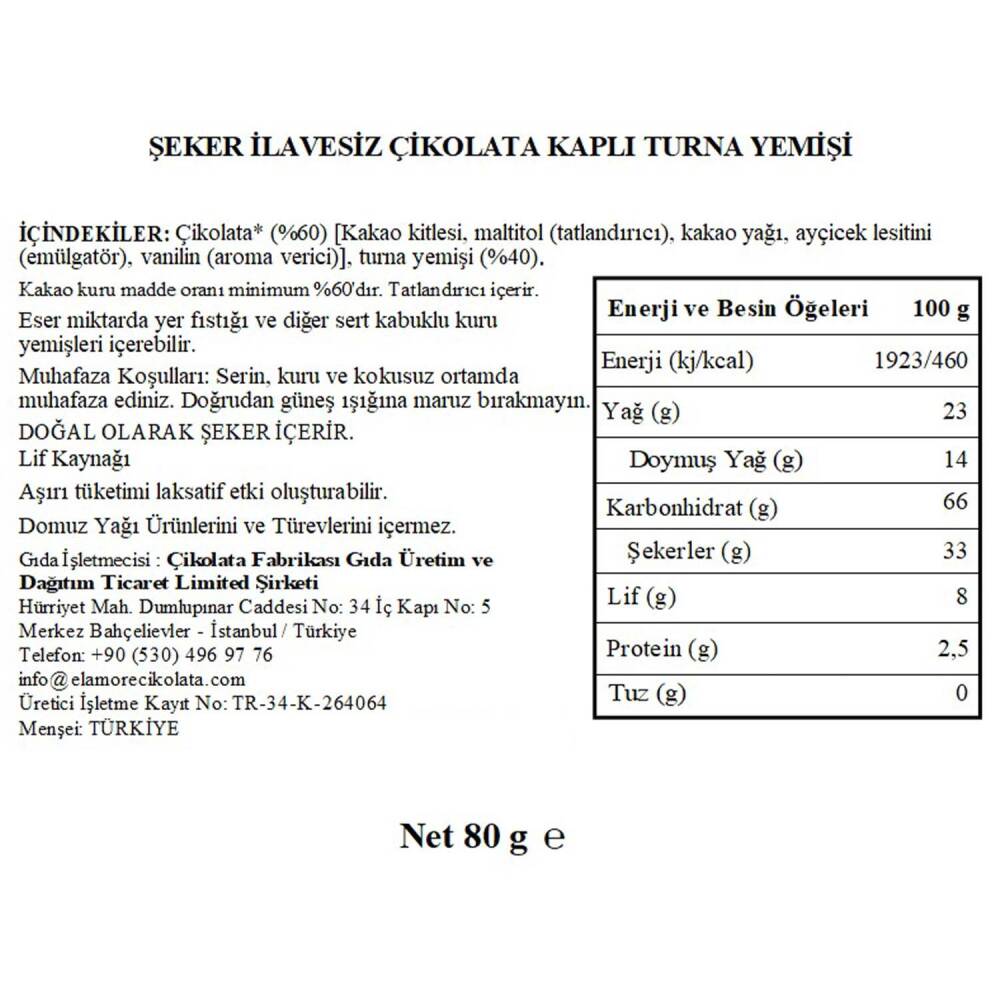 Çikolata* (%50) [Kakao kitlesi, maltitol (tatlandırıcı), kakao yağı, ayçiçek lesitini (emülgatör), vanilin (aroma verici)], turna yemişi (%40).