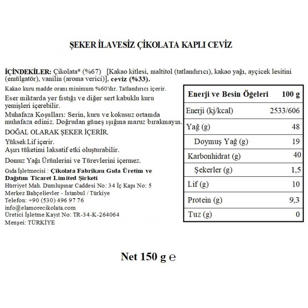 Çikolata* (%67) [Kakao kitlesi, maltitol (tatlandırıcı), kakao yağı, ayçiçek lesitini (emülgatör), vanilin (aroma verici)], ceviz (%33).